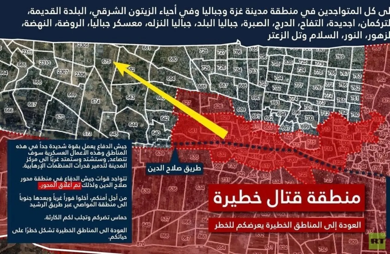 وقال الجيش في بيان له : "تحذير خطير الى كل المتواجدين في منطقة مدينة غزة وجباليا وفي أحياء الزيتون الشرقي، البلدة القديمة، التركمان، اجديدة، التفاح، الدرج، الصبرة، جباليا البلد، جباليا النزله، معسكر جباليا، الروضة، النهضة، الزهور، النور، السلام وتل الزعتر" ، "الجيش يعمل بقوة شديدة جدا في هذه المناطق وهذه الأعمال العسكرية سوف تتصاعد، وستشتد وستمتد غربا الى مركز المدينة. نخبركم أن قواتنا تتواجد في منطقة محور صلاح الدين ولذلك تم أغلاق المحور".