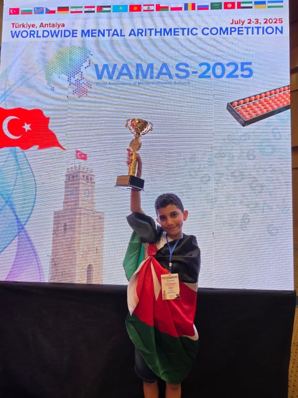 خبرني - في إنجاز أردني يُضاف إلى سلسلة النجاحات المتواصلة لمركز العبقري الصغير، حقق الطالب خالد الصالحي لقب Super Champion في المسابقة العالمية للحساب الذهني WAMAS 2025، والتي أُقيمت بمشاركة أكثر من 500 طالب من 20 دولة حول العالم.