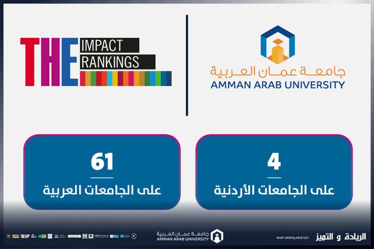 خبرني - ضمن جهود جامعة عمان العربية المستمرة لتعزيز مكانتها الأكاديمية وتحقيق أهداف التنمية المستدامة، حققت الجامعة إنجازًا نوعيًا جديدًا يُضاف إلى سجلها الحافل بالتميّز، بحصولها على المرتبة الرابعة على مستوى الجامعات الأردنية والمرتبة (61) على مستوى الجامعات العربية، وذلك ضمن تصنيف "تايمز للتأثير" (THE Impact Ranking) لعام 2025، وضمن الفئة (601–800) عالميًا لعام 2025.