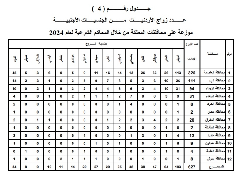 وعلى الجانب الآخر، شهد العام الماضي زواج 3090 أردنية من عرب، و627 أردنية من أجانب.