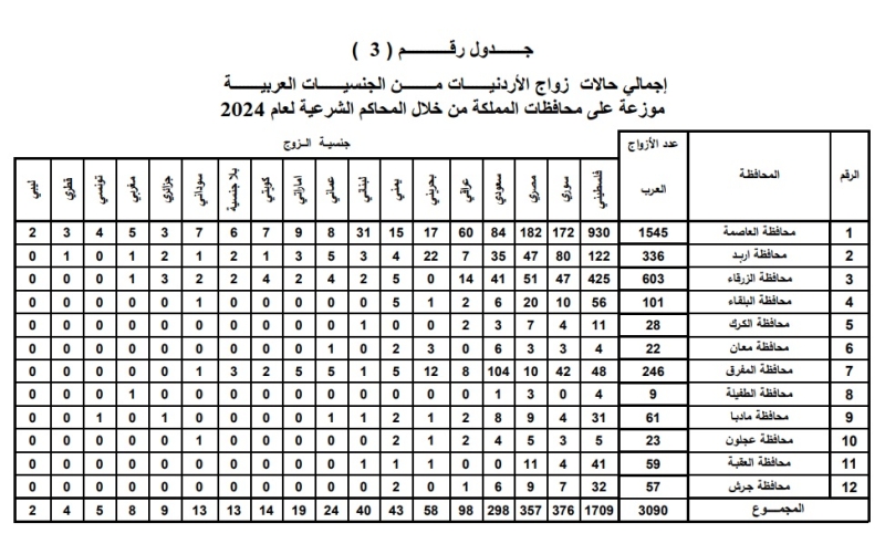 وبحسب رصد خبرني بلغ عدد حالات زواج الأردنيين من عربيات 3333 حالة.