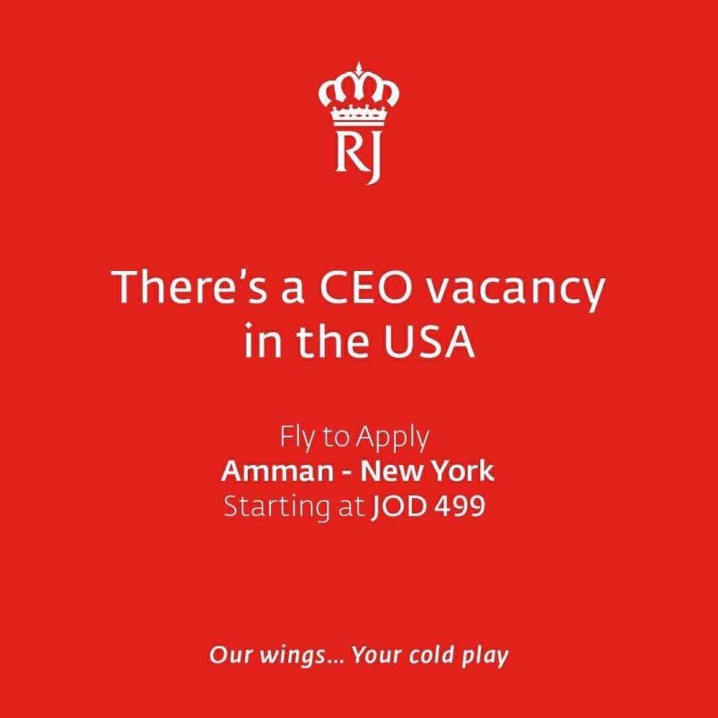 وجاء في الإعلان الذي نُشر عبر قنوات الشركة الرسمية: "There's a CEO vacancy in the USA – Fly to Apply"، في دعوة ساخرة للسفر من عمّان إلى نيويورك بأسعار تبدأ من 499 دينارًا أردنيًا، مع استخدام جملة ختامية ذات طابع طريفة: "Our wings… Your cold play"، في تلميح مباشر إلى الفرقة الموسيقية التي ارتبط اسمها بالحادثة.