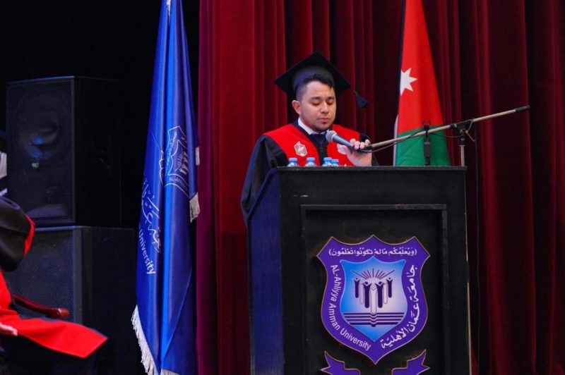• وألقى كلمة الخريجين والخريجات الطالب أحمد إبراهيم الجديد / تخصص اللغة الإنجليزية والترجمة بكلية الاداب والعلوم ، حيث رحب بصاحبةُ السموِّ الملكيِّ راعية الحفلِ، وبعطوفةُ الدكتور ماهر الحوراني رئيسُ هيئةِ المديرين وبعطوفةُ الأستاذ الدكتور ساري حمدان رئيسُ الجامعةِ ،وبنائبُ الرئيس والعمداءُ والاساتذة وبأهالي الخريجين ، ثم قال : أقف أمامكم اليوم ممثلًا عن زملائي وزميلاتي الخريجين، في لحظةٍ تحمل في ظاهرها نهايةَ مرحلة، لكنها في حقيقتها انتقالٌ إلى ما بعدها لحظةٌ نحاول فيها أن نُعيد ترتيبَ ما مرّ، لا على هيئةِ حنينٍ لما فات، بل على هيئةِ وعيٍ بما هو آت.