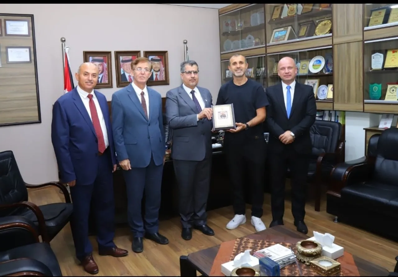 وسلّم رئيس الجامعة، الأستاذ الدكتور رامي عبد الرحيم، درعًا تذكاريًا للمدرب هايل خلال استقباله في مكتبه، بحضور عميد شؤون الطلبة، الأستاذ الدكتور إياد الملاح، وعميد كلية الآداب والعلوم، الأستاذ الدكتور محمود السلمان، ومدير دائرة العلاقات العامة والدولية، السيد علاء عربيات.