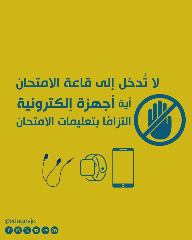 لا تُدخل/ي إلى قاعة الامتحان أية أجهزة إلكترونيَّة؛ التزامًا بتعليمات الامتحان.