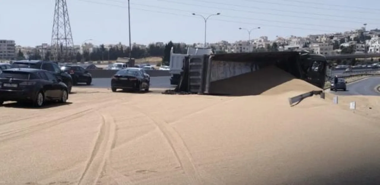 وأعلنت مديرية الأمن العام عن تباطؤ مؤقت في حركة السير بسبب انقلاب المركبة المحملة بالرمل.