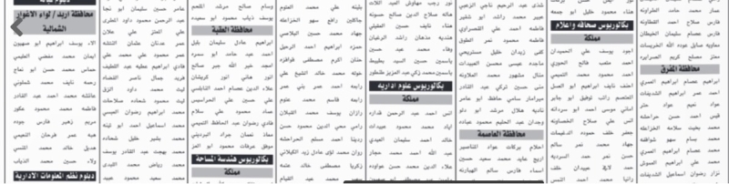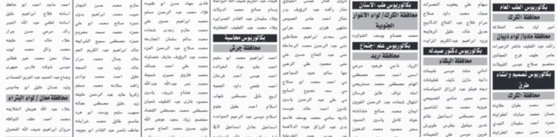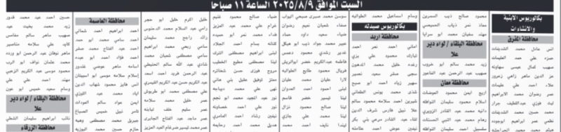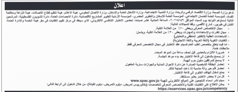 خبرني - دعت وزارات الصحة والاقتصاد الرقمي والتنمية الاجتماعية والأشغال العامة والاتصال الحكومي وهيئة الإعلام وهيئة تنظيم قطاع الاتصالات وهيئة النزاهة ومكافحة الفساد والمؤسسة العامة للضمان الاجتماعي والمؤسسة العامة للإسكان والتطوير الحضري والمؤسسة الأردنية لتطوير المشاريع الاقتصادية ودائرة الإحصاءات العامة ودائرة الشؤون الفلسطينية، اليوم الثلاثاء، المرشحين التالية أسماؤهم التواجد يوم السبت 9/8/2025 لحضور الاختبار التنافسي الإلكتروني.