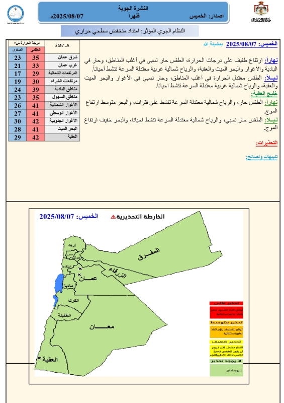 نهاراً: ارتفاع طفيف على درجات الحرارة، الطقس حار نسبي في أغلب المناطق، وحار في البادية والأغوار والبحر الميت والعقبة، والرياح شمالية غربية معتدلة السرعة تنشط أحياناً.