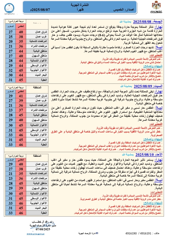 نهاراً: يستمر تأثير الموجه الحارة والجافة على المملكة، حيث يسود طقس حار و مغبر في اغلب المناطق، وشديد الحرارة في البادية والأغوار والبحر الميت والعقبة، مع ظهور كميات من الغيوم على ارتفاعات متوسطة وعالية، وهناك احتمال ضعيف في ساعات المساء لهطول زخات محلية خفيفة من المطر ولفترات قصيرة في أجزاء متفرقة من جنوب وشرق المملكة، الرياح شمالية شرقية إلى شمالية غربية معتدلة إلى نشطة السرعة خاصة في مناطق البادية.