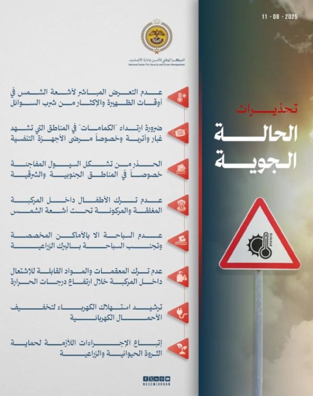 وأكد المركز على ضرورة اتباع النصائح والإرشادات الصادرة عنه وعن الجهات المختصة: