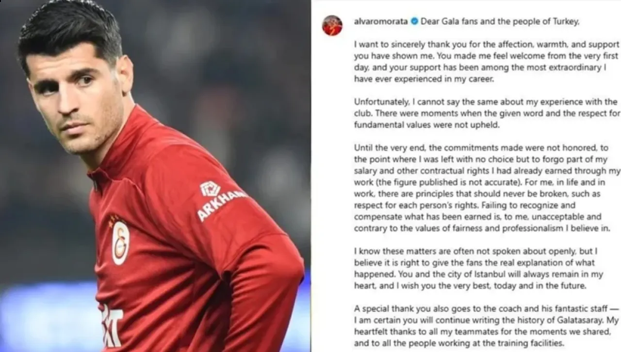 خبرني - أعلن المهاجم الإسباني ألبارو موراتا عن رحيله عن صفوف نادي غلطة سراي التركي عبر رسالة وجّه من خلالها الشكر للجماهير ولزملائه ووجّه فيها أيضاً انتقادات لاذعة لمجلس إدارة النادي متهما إياه بعدم الالتزام بالوعود المتفق عليها وعدم احترام القيم الأساسية.