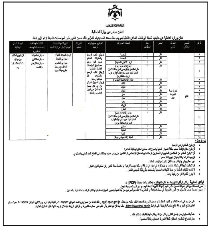 ودعت الوزارة الراغبين في التقدم ممن يجدون في أنفسهم الكفاءة والخبرة المطلوبة إلى تقديم طلباتهم عبر الرابط: app3.spac.gov.jo، اعتبارًا من صباح يوم الأحد 17 آب 2025 وحتى نهاية دوام يوم الاثنين 25 آب 2025.