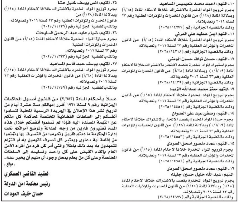 خبرني - أمهلت محكمة أمن الدَّولة اليوم الأثنين متهمين، 10 أيَّام لتسليم أنفسهم للسلطات المختصة لمحاكمتهم على التهم المسندة إليهم، وإلا سيتم اعتبارهم فارين من وجه العدالة.