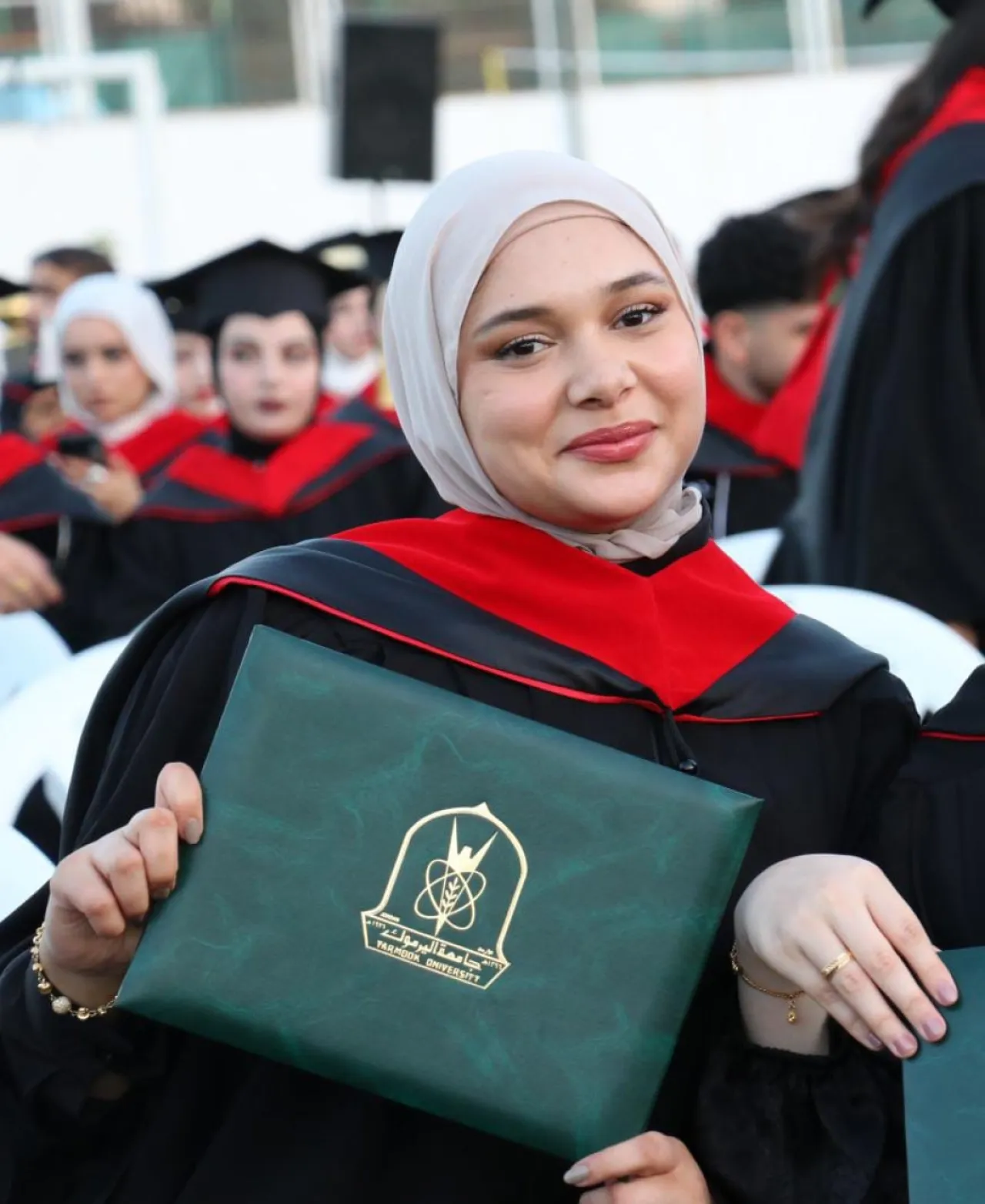 خبرني - يتقدم الصحفي رامي العطيات وزوجته علا الجبر  بأجمل التهاني والتبريكات إلى بسملة عواد الجبر بمناسبة تخرجها من جامعة اليرموك تخصص إذاعة وتلفزيون وحصولها على تقدير جيد جدًا.