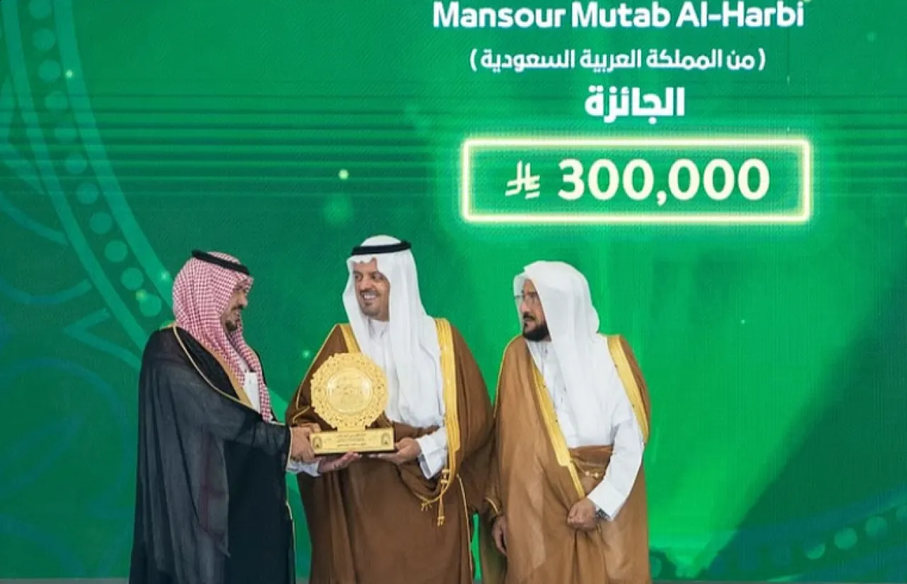 خبرني - في مشهد مؤثر يختزل معاني الفخر والاعتزاز، تسلّم والد المتسابق السعودي منصور بن متعب الحربي، جائزة المركز الأول في الفرع الثاني من مسابقة الملك عبدالعزيز الدولية لحفظ القرآن الكريم وتلاوته وتفسيره، نيابةً عن ابنه الذي تفوّق في حفظ كتاب الله كاملاً، مع حسن الأداء والتجويد وتفسير المفردات.