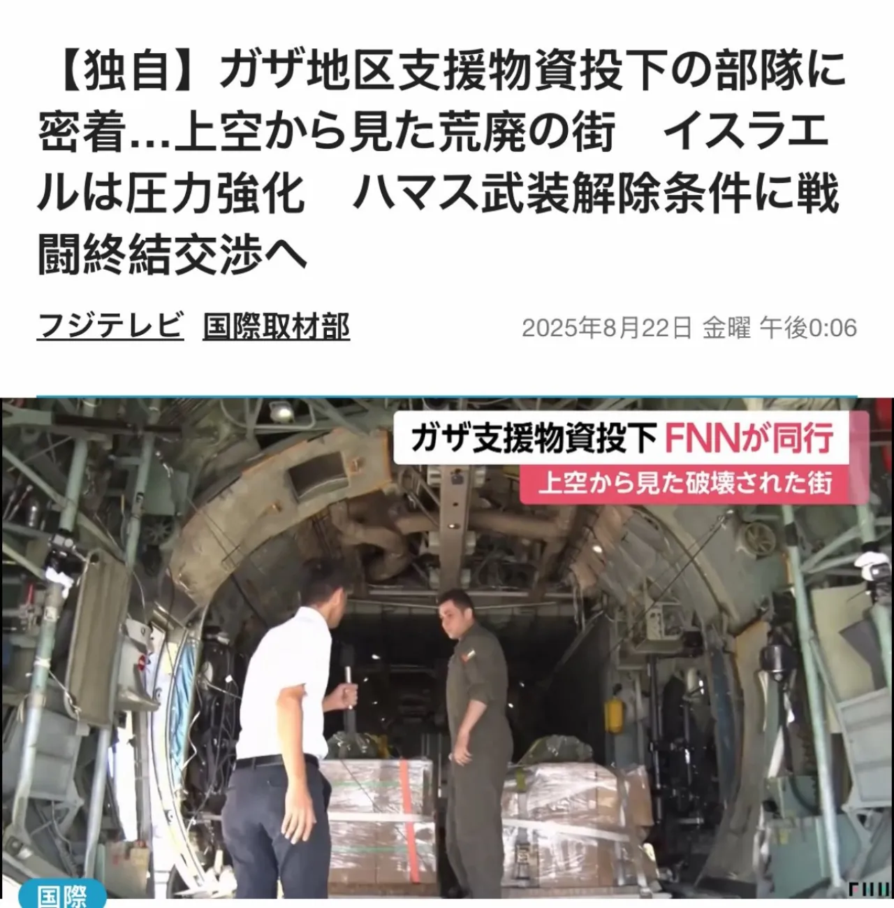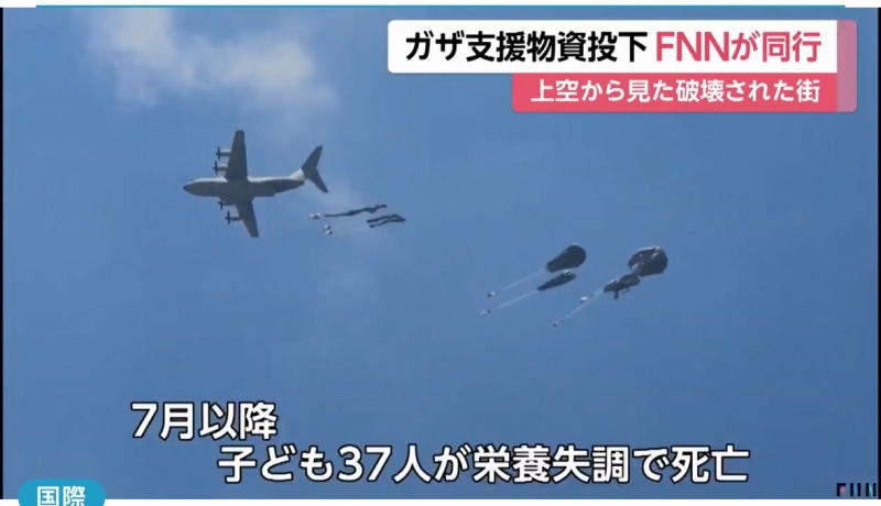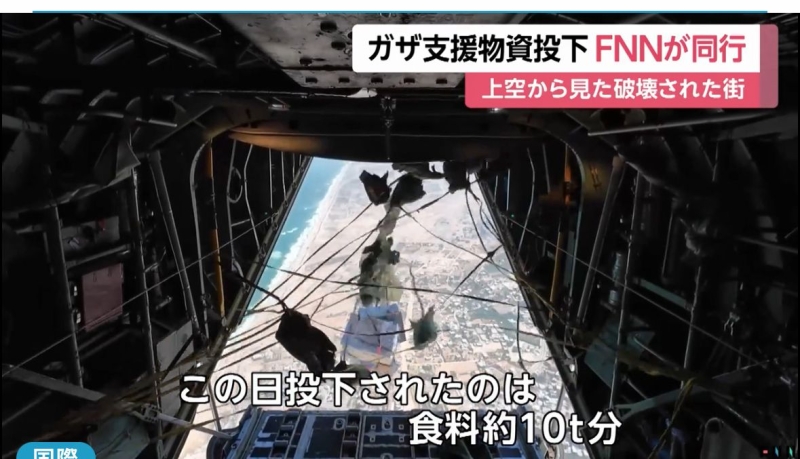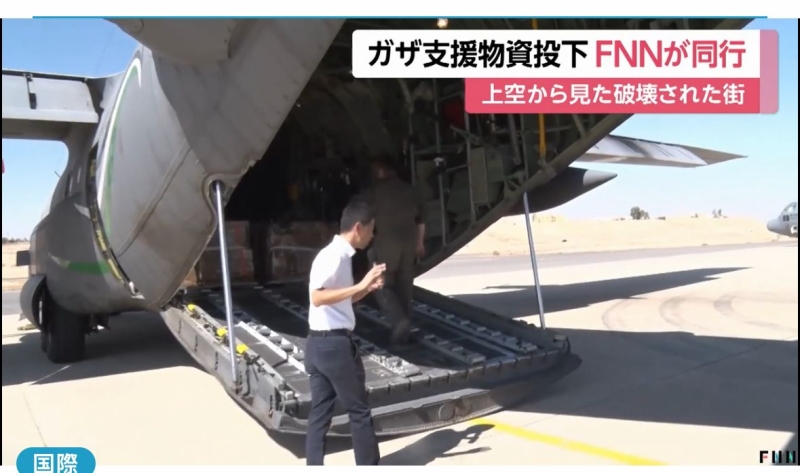 خبرني - قام فريق تلفزيوني يمثل شبكة قنوات فوجي اليابانية بمرافقة احدى طائرات سلاح الجو الملكي الأردني خلال عمليات الإنزال الجوي للمساعدات إلى قطاع غزة .