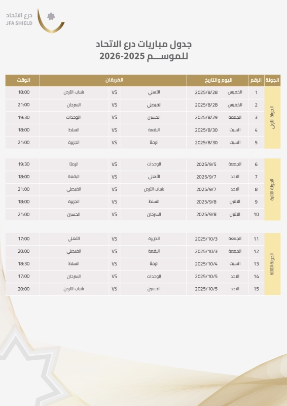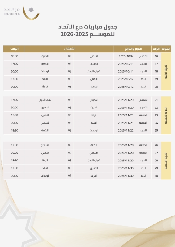 وتقام البطولة أثناء فترات التوقف الدولية، لمنح أكبر عدد من اللاعبين فرصة المشاركة، والوقوف على مستوياتهم، إلى جانب استكشاف لاعبين جدد من الفئات العمرية. وتقام الجولة الأخيرة منتصف شهر كانون الأول (ديسمبر) المقبل، على أن يحدد اتحاد الكرة المواعيد لاحقا، من خلال المواجهات التي تجمع الرمثا مع الحسين، البقعة مع الجزيرة، الفيصلي مع الوحدات، شباب الأردن مع السلط، الأهلي مع السرحان.
