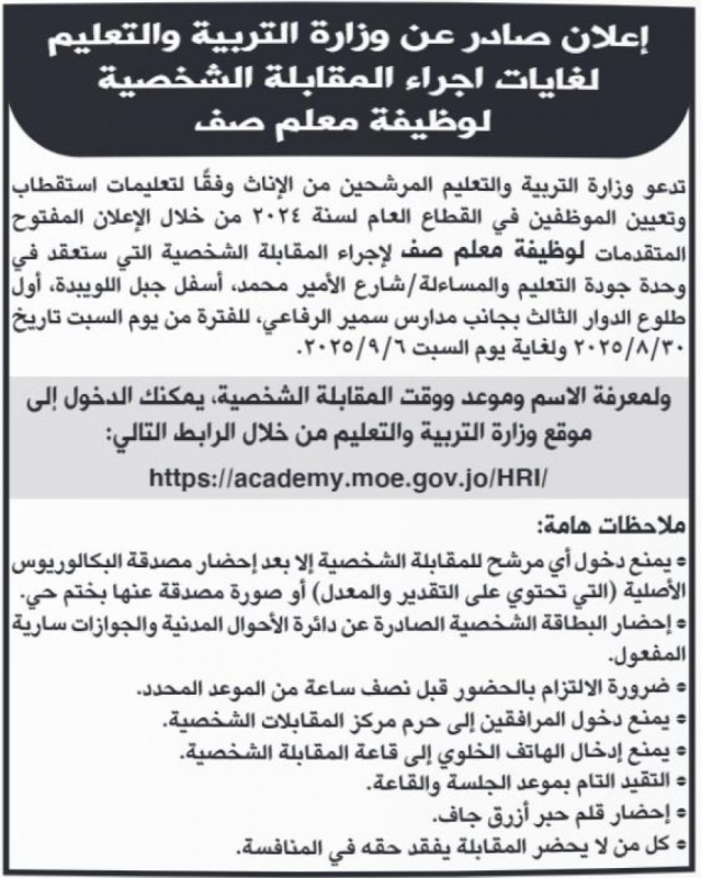 ودعت وزارة التربية والتعليم مرشحين لاجراء مقابلات شخصية لوظيفة معلم صف.