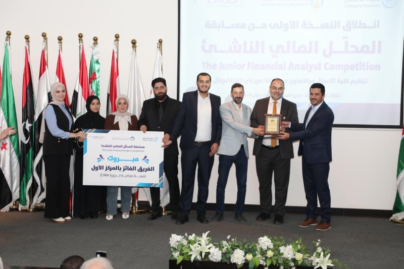 خبرني - في إطار سعي جامعة عمان العربية لتعزيز كفاءة الطلبة وتنفيذاً لتوجيهات الأستاذ الدكتور محمد الوديان رئيس الجامعة لصقل شخصية الطلبة وإكسابهم خبرات تنافسية، وتنمية معارفهم من خلال الانخراط في تجارب عملية مع زملائهم من مختلف الجامعات الأردنية، نظمت كلية الأعمال في الجامعة مسابقة " المحلل المالي الناشئ والتي نُظّمت بالتعاون شركة Morgan International الراعي الرسمي للمسابقة والداعم لإنجاح هذا الحدث المتميز، وذلك انطلاقاً من حرصها على تنمية قدرات الشباب الأردني وتأهيلهم للحصول على الشهادات المهنية العالمية، وبمشاركة مجموعة من الطلبة من (5) جامعات أردنية، حيث هدفت المسابقة إلى تعزيز مهارات التحليل المالي والتفكير الاستراتيجي لدى الطلبة، وربط الجانب الأكاديمي بالتطبيق العملي في أسواق المال، وقدّم طلبة كلية الأعمال في جامعة عمان العربية خلال المسابقة تحليلاً مالياً متقدماً لشركة مصفاة البترول الأردنية، شمل دراسة بياناتها المالية والتوقعات المستقبلية لسعر السهم، مستخدمين أحدث أدوات وأساليب التقييم والتحليل المالي.