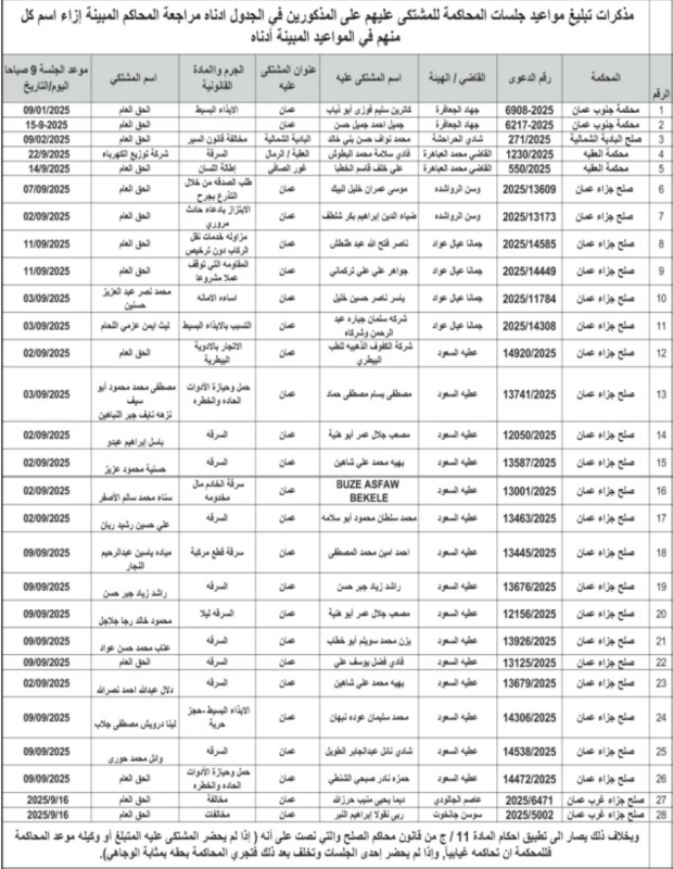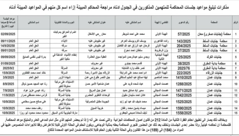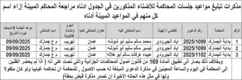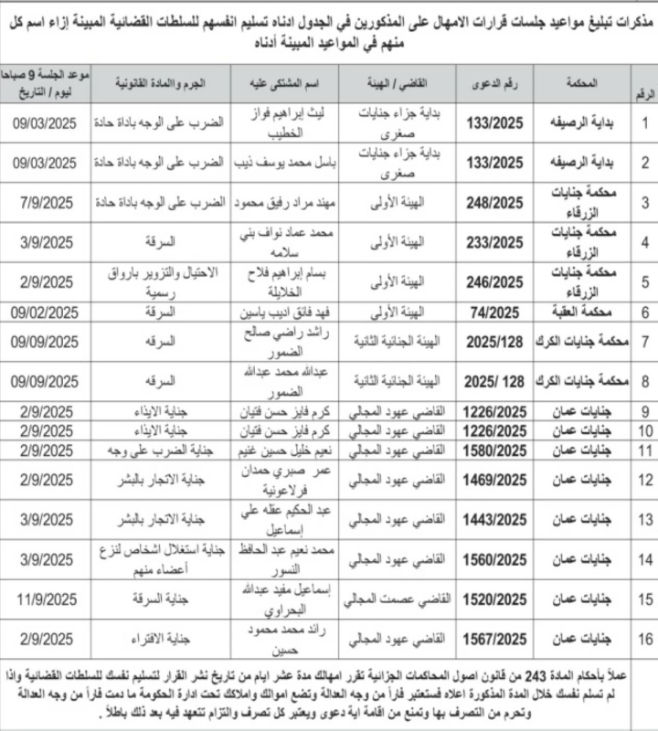 خبرني - أصدرت المحاكم الأردنية، اليوم الاثنين، مذكرات تبليغ لمواعيد جلسات محاكمة تخص عدداً من المشتكى عليهم والمتهمين والأظناء، إلى جانب قرارات تتعلق بمهَل قانونية جديدة.