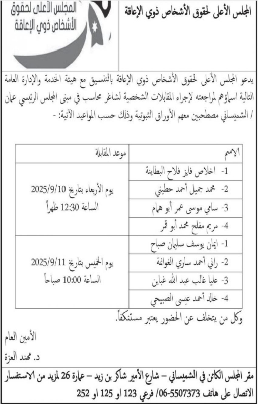 كما دعا المجلس الاعلى لحقوق الاشخاص ذوي الاعاقة إلى مراجعته لاجراء المقابلات الشخصية لغايات التعيين.