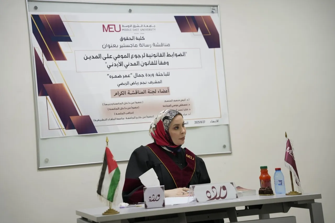 خبرني - نوقشت في كلية الحقوق بجامعة الشرق الاوسط رسالة ماجستير هي الأولى من نوعها بحسب مختصين حول " الضوابط القانونية لرجوع الموفي على المدين وفقا للقانون المدني الاردني " وتأتي اهمية الرسالة في كونها تأسست وفق حالة عملية ميدانية حياتية جرى نقلها من اروقة القضاء الشرعي الى المحاكم النظامية الأردنية في حالة هي الأولى من نوعها في الاردن .