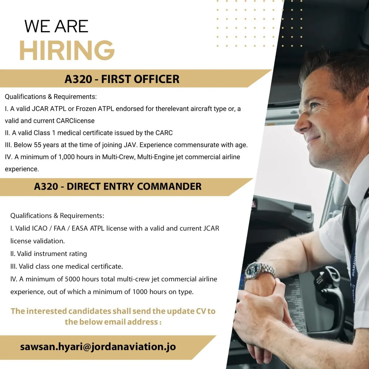 خبرني - تعلن الأردنية للطيران عن فتح باب التوظيف للانضمام إلى طاقمنا المتميز على متن طائرات A320: