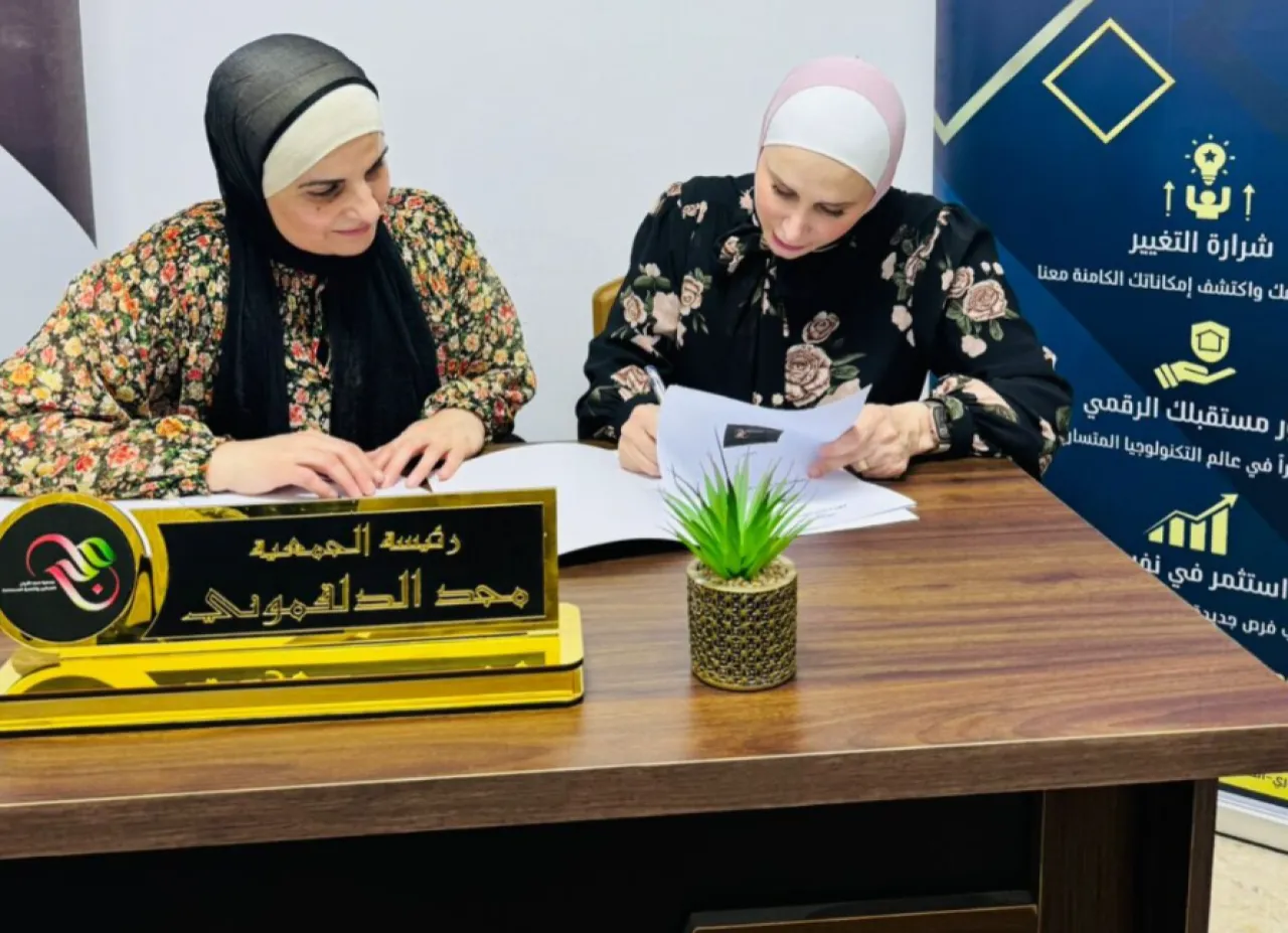 خبرني - في خطوة نوعية تعكس الشراكة الفاعلة بين مؤسسات المجتمع المدني، تم اليوم في محافظة إربد توقيع مذكرة تفاهم لإطلاق مبادرة “محو أمية التكنولوجيا الرقمية: بوابة للتمكين والتنمية المستدامة” بين أكاديمية الليث للتدريب والتطوير ممثلة بالمدير العام م. صفية دعباس، وجمعية مجد الأردن للتمكين والتنمية المستدامة ممثلة برئيستها السيدة مجد الدلقموني.