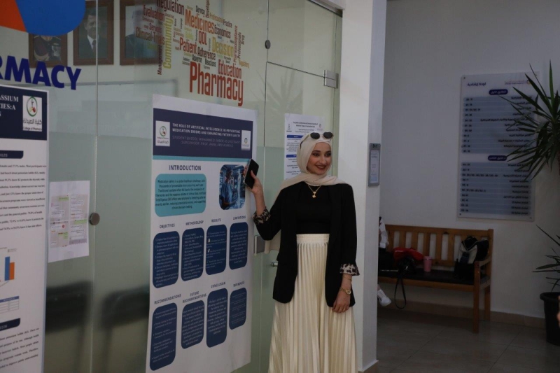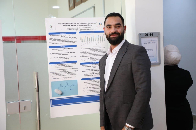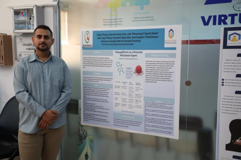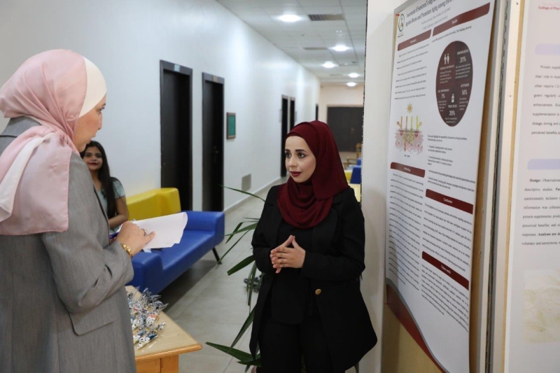 في إطار تعزيز البحث العلمي والابتكار الطلابي وحرص جامعة عمان العربية على توفير بيئة أكاديمية داعمة للإبداع وتنمية قدرات الطلبة البحثية، عرض طلبة كلية الصيدلة مشاريعهم البحثية المتميزة بحضور كل من: الأستاذ الدكتورة رنا أبو حويج عميد كلية الصيدلة، والدكتورة سارة ناصر الدين مساعد عميد الكلية، والدكتور عادل أردكاني رئيس قسم الصيدلة، وعدد من أعضاء الهيئة التدريسية والطلبة، حيث تم تقديم الأبحاث على شكل ملصقات ضمن مساق "ممارسة الصيدلة" والذي يعتمد على أساليب التعلم الحديثة والتعلم النشط مع تقييم قائم على المشاريع البحثية، حيث تناولت المشاريع موضوعات تمس واقع الممارسة الصيدلانية اليومية، حيث شكّل هذا الأسلوب فرصة للطلبة لتطبيق معرفتهم النظرية عمليًا، وتعزيز مهاراتهم في التحليل المستقل واكتساب الخبرة في تصميم الدراسات العلمية ومتابعة النتائج بشكل عملي ومباشر.