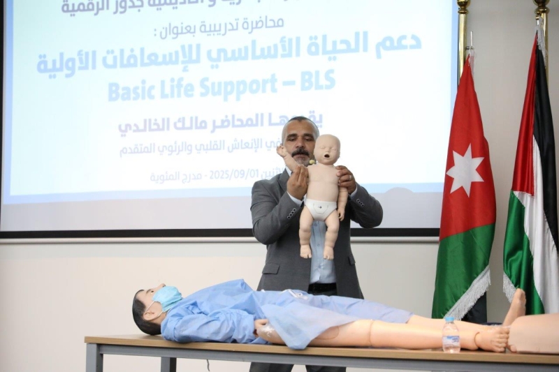 خبرني - نظم المركز الصحي بالشراكة مع دائرة الموارد البشرية في جامعة عمان العربية وبالتعاون مع أكاديمية جذور الرقمية، محاضرة تدريبية بعنوان""دعم الحياة الأساسي للإسعافات الأولية – Basic Life Support (BLS)"، قدمها الأستاذ مالك الخالدي المتخصص في الإنعاش القلبي الرئوي، ومدير المركز التدريبي في نقابة الممرضين وعضو اللجنة الوطنية لتطوير المهن في المجلس الصحي العالي، وبحضور الأستاذ الدكتور إسماعيل يامين مساعد الرئيس للشؤون الأكاديمية مندوباً عن الأستاذ الدكتور محمد الوديان رئيس جامعة عمان العربية، والأستاذ محمد البستنجي ممثلاً عن أكاديمية جذور الرقمية وعدد من أعضاء الهيئتين التدريسية والإدارية والطلبة في الجامعة.