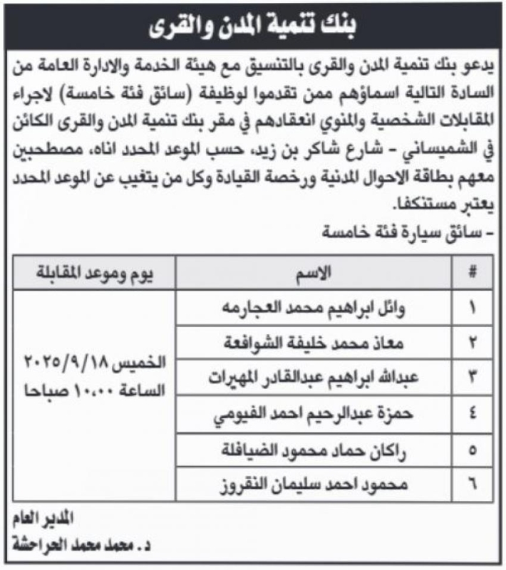 كما اعلن بنك تنمية المدن والقرى اسماء المدعوين لاجراء المقابلات الشخصية.