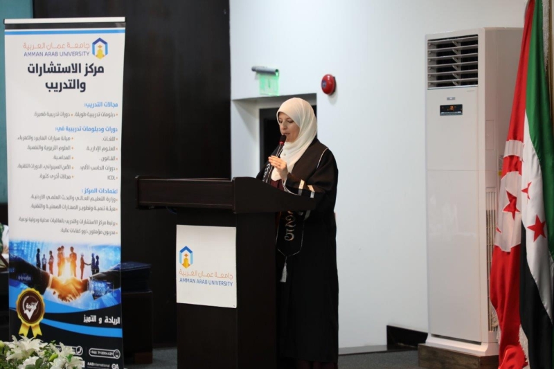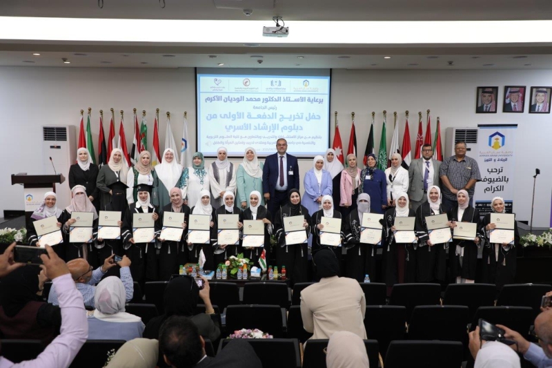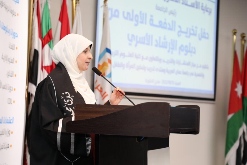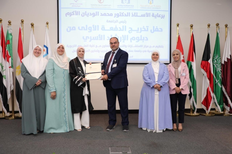 خبرني - برعاية رئيس جامعة عمان العربية الأستاذ الدكتور محمد الوديان، وانسجامًا مع فلسفة الجامعة القائمة على مدّ جسور الشراكة مع مؤسسات المجتمع المدني، وخدمة القضايا الكبرى التي تمس حياة كل أسرة أردنية، نظم مركز الاستشارات والتدريب بالتعاون مع كلية العلوم التربوية والنفسية في الجامعة ومنتدى تدريب وتمكين المرأة والطفل حفل تخريج الفوج الأول من طلبة الدبلوم التدريبي "الارشاد الأسري التربوي"، وذلك بحضور الأستاذ الدكتور إسماعيل يامين مساعد الرئيس للشؤون الأكاديمية مندوباً عن رئيس الجامعة.
