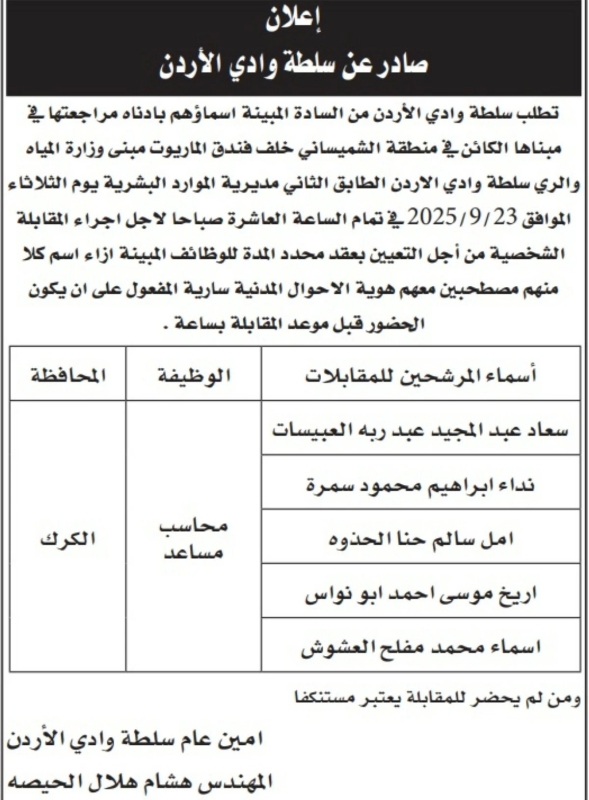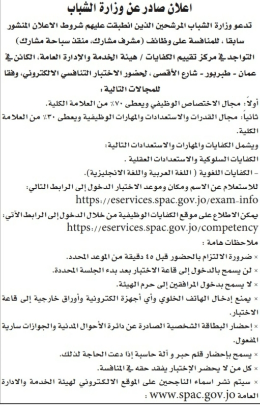 خبرني - أعلنت وزارة الشباب وعدد من المؤسسات الحكومية، اليوم الثلاثاء، عن شواغر وظيفية، فيما دعت مؤسسات أخرى عددا من المرشحين لإجراء المقابلات الشخصية والامتحان التنافسي لغايات التعيين.