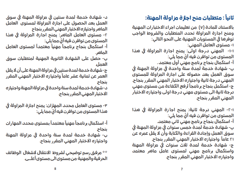 وأضاف الشواربة انه بالنسبة لمستوى العامل الماهر، فعليه أن يستكمل برنامجا مهنيا معتمداً لمستوى العامل الماهر بنجاح، وان يكون حاصلا على الشهادة الثانوية المهنية لمتطلبات سوق العمل اضافة الى شهادة خدمة لمدة سنة في مزاولة المهنة و نجاحه في الاختبار، و شهادة خدمة لمدة سنتين في مزاولة المهنة في سوق العمل بعد الحصول على إجازة المزاولة لمستوى العامل الماهر واجتيازه الاختبار بنجاح.