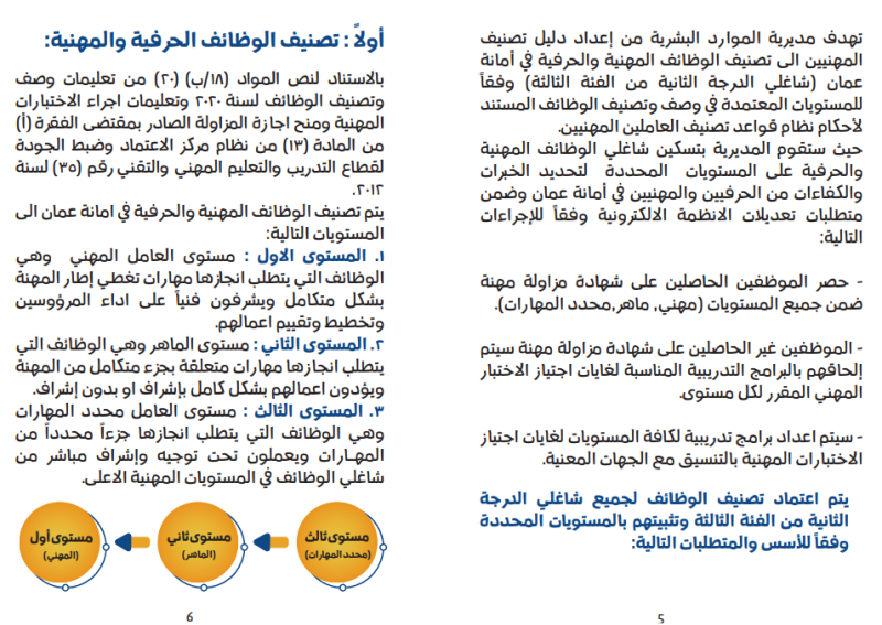 وأوضح الشواربة انه من خلال هذا التصنيف فان الأمانة ستقوم بتسكين شاغلي الوظائف المهنية والحرفية على المستويات المحددة لتحديد الخبرات والكفاءات من الحرفيين والمهنيين في أمانة عمان وضمن متطلبات تعديلات الانظمة الالكترونية من خلال حصر الموظفين الحاصلين على شهادة مزاولة مهنة ضمن جميع المستويات بمهني، و ماهر ومحدد المهارات، بينما سيتم إلحاق الموظفين غير الحاصلين على شهادة مزاولة مهنة بالبرامج التدريبية المناسبة لغايات اجتياز الاختبار المهني المقرر لكل مستوى، كما سيتم إعداد برامج تدريبية لكافة المستويات لغايات اجتياز الاختبارات المهنية بالتنسيق مع الجهات المعنية
