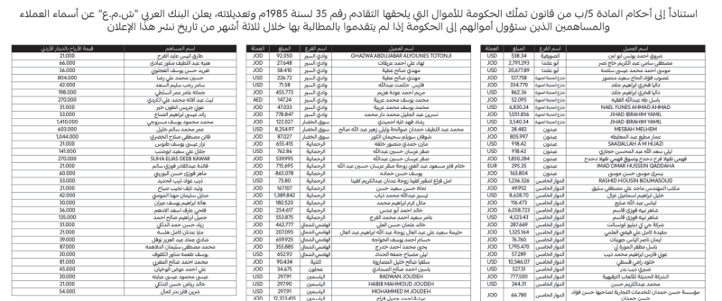 ويأتي هذا الإعلان وفق خبرني استنادا إلى أحكام المادة (5/ب) من قانون تملك الحكومة للأموال التي يلحقها التقادم، والذي ينظم آلية التصرف في الأموال غير المطالب بها بعد مرور المدة القانونية المحددة.