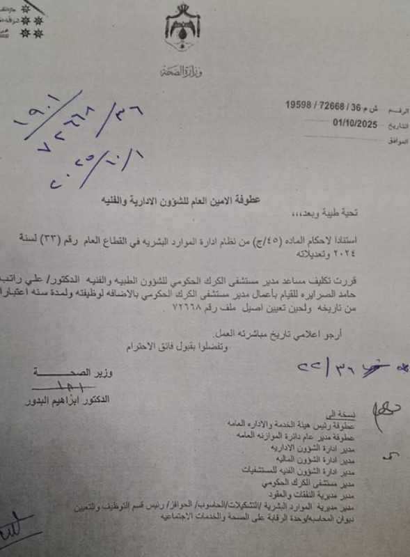 خبرني - علم موقع خبرني بأن وزير الصحة الدكتور إبراهيم البدور، كلف مساعد مدير مستشفى الكرك الحكومي، الدكتور على راتب الصرايرة بأعمال مدير المستشفى بالإضافة لوظيفته ولمدة عام.