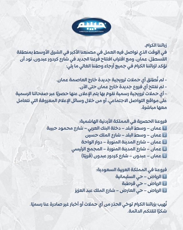 في الوقت الذي نواصل فيه العمل في مصنعنا الأكبر في الشرق الأوسط بمنطقة القسطل، عمان، ومع اقتراب افتتاح فرعنا الجديد في شارع كردور عبدون، نود أن نؤكد لزبائننا الكرام في جميع أرجاء وطننا الغالي ما يلي: