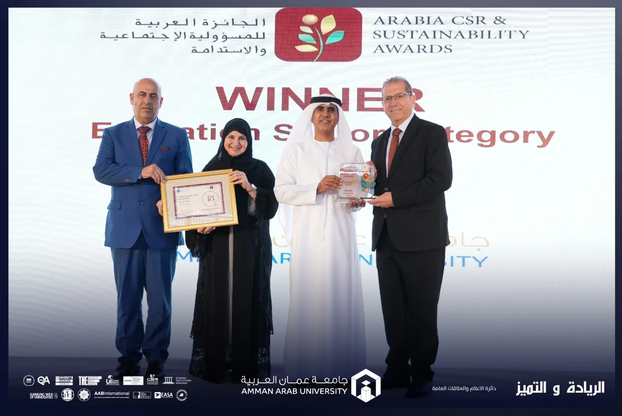 خبرني - برعاية سمو الشيخ المهندس سالم بن سلطان بن صقر القاسمي فازت جامعة عمان العربية بالمركز الأول عن فئة المؤسسات التعليمية في الجائزة العربية للمسؤولية الاجتماعية والاستدامة لعام 2025 في دورتها الثامنة عشرة، والتي نظمتها الشبكة العربية للمسؤولية الاجتماعية للمؤسسات (ARABIA CSR) في إمارة دبي، حيث مثّل الجامعة في حفل التكريم كل من: الأستاذ الدكتور محمد الوديان رئيس جامعة عمان العربية، والسيد بسام البشايرة مستشار الجامعة للمسؤولية المجتمعية.