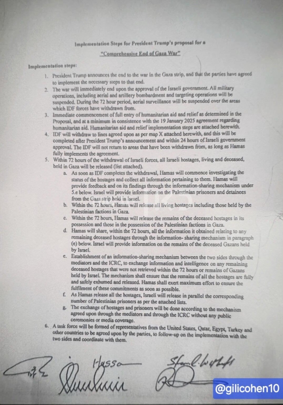 خبرني - نشرت وسائل إعلام أمريكية وثيقة قالت إنها تتضمن المحاور الأساسية الستة التي وُقّعت عليها الأطراف الثلاث: حركة حماس، والحكومة الإسرائيلية، والولايات المتحدة الأمريكية.