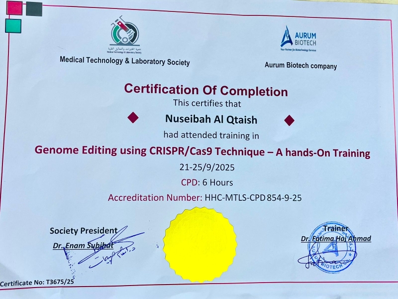 في إطار التزام جامعة عمان العربية المتواصل بدعم البحث العلمي والابتكار ، اجتازت الدكتورة نسيبة القطيش من كلية الصيدلة في جامعة عمان العربية برنامجاً تدريبياً متقدماً بعنوان: "CRISPR/Cas9 Genome Editing "، الذي نظمته مؤسسة AURUM BIOTECH بواقع (30) ساعة تدريبية شملت الجوانب النظرية والتطبيقية والبرمجية ، والذي استمر لمدة خمسة أيام تدريبية مكثفة تناولت مقدمة شاملة حول تقنية CRISPR/Cas9 وآفاقها العلمية، والتصميم الحاسوبي للبُنى الجينية، إلى جانب تطبيقات عملية في المختبر تضمنت تحضير العينات وفحصها واستخلاص البلازميد، وصولاً إلى التحقق من النتائج من خلال تقنيات التسلسل الجيني الحديثة.