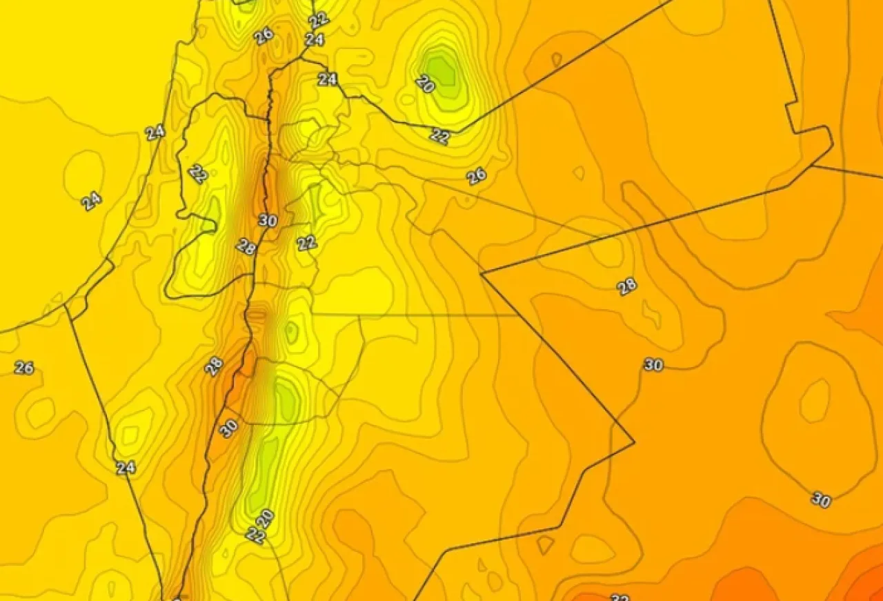نهار يوم الأحد، من المتوقع أن تنخفض درجات الحرارة بشكل طفيف لتبقى دون معدلاتها الاعتيادية لهذا الوقت من العام، ليكون الطقس خريفي لطيف الى معتدلة في مختلف المناطق مع انتشار كميات من الغيوم قد تعمل على هطول زخات متفرقة من المطر في شمال المملكة. وتتراوح درجات الحرارة نهارًا في المرتفعات الجبلية بين 20 و22 درجة مئوية، بينما تصل في الأغوار والبحر الميت ومدينة العقبة بين 30 و33 درجة مئوية.