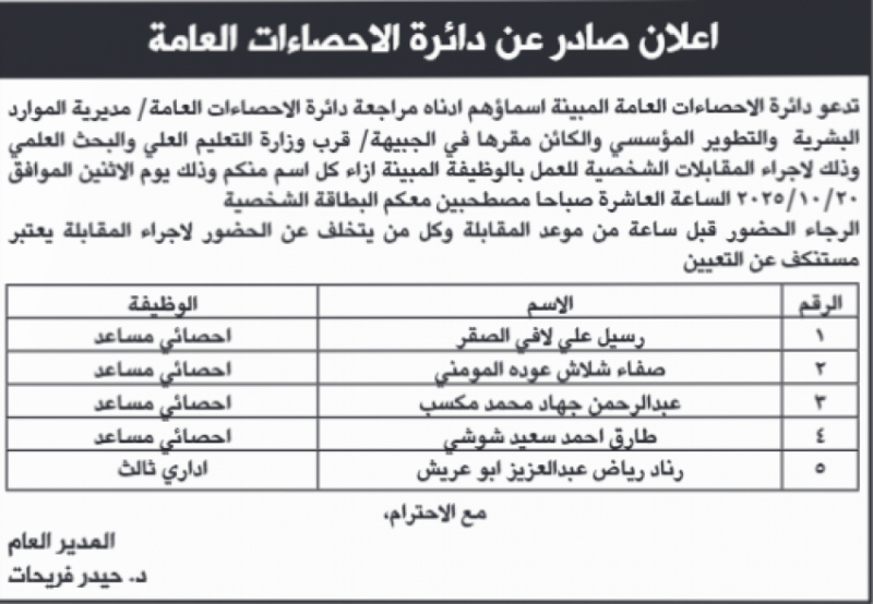 خبرني - أعلنت وزارة السياحة والاثار عن عدد من الوظائف الشاغرة، كما دعت هيئة الأوراق المالية، ودائرة الاحصاءات العامة، المرشحين المستوفين للشروط لاجراء المقابلة الشخصية.