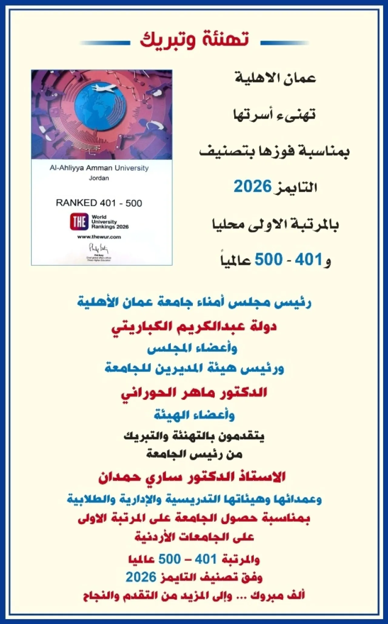 بمناسبة حصول الجامعة على المرتبة الاولى على الجامعات الأردنية