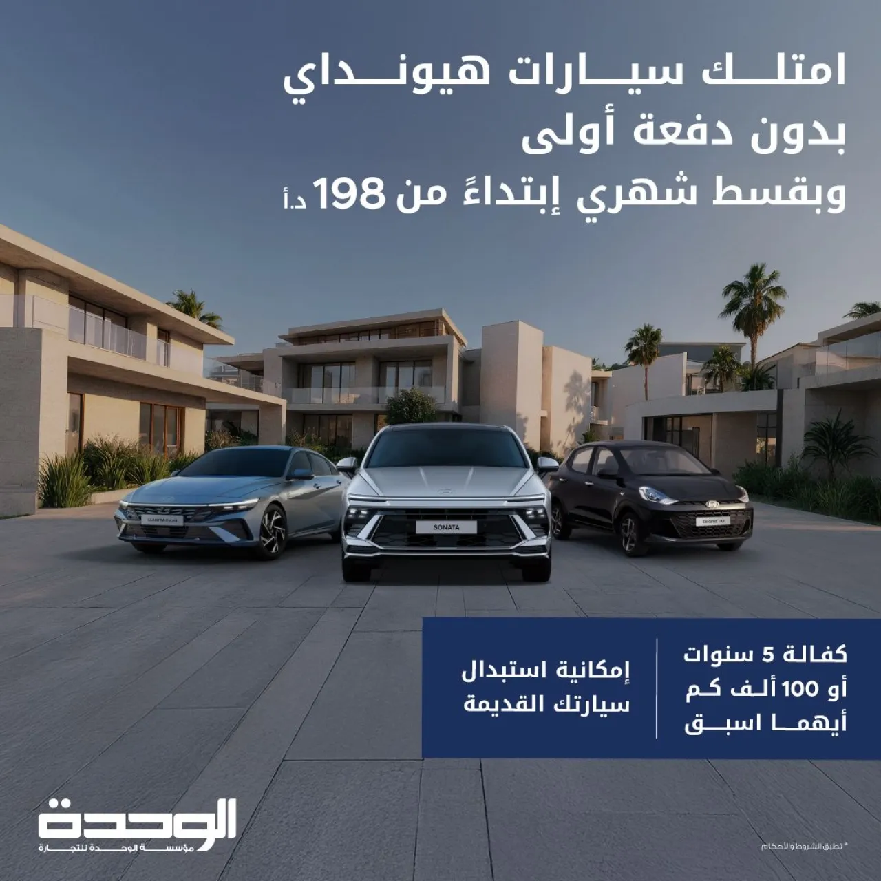 خبرني - أعلنت مؤسسة الوحدة للتجارة، الوكيل الحصري لعلامة هيونداي في الأردن، عن إطلاق عرض مميز يتيح للعملاء امتلاك سيارات هيونداي الجديدة بدون دفعة أولى، وبأقساط شهرية تبدأ من 198 ديناراً فقط.