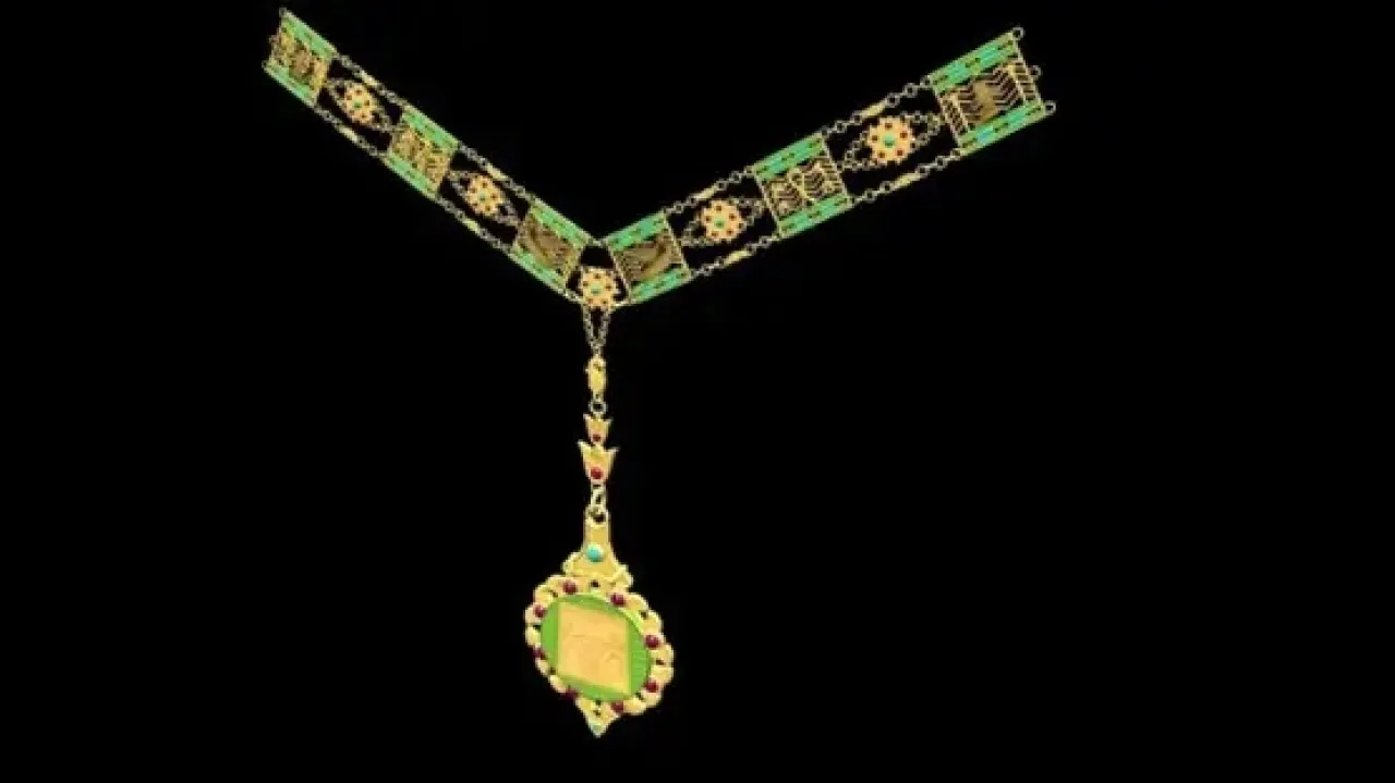 The order features a clasp in the form of two lotus flowers. It is circular in shape and decorated with pharaonic flowers, enamel, red and blue beads. In the center, there is a prominent design representing the symbol of the Nile, united between the north (papyrus) and the south (lotus flower).