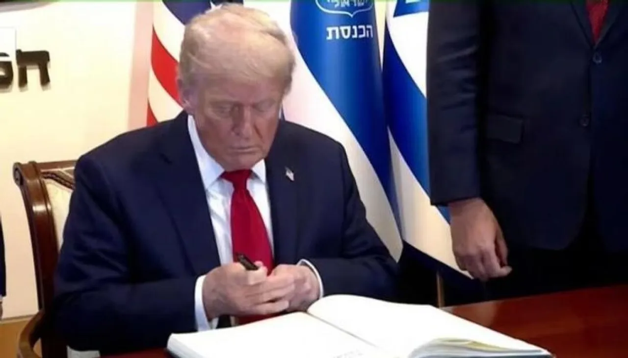 وقبل دخوله قاعة الكنيست لإلقاء خطابه، وقّع ترمب في سجل زوار الكنيست.