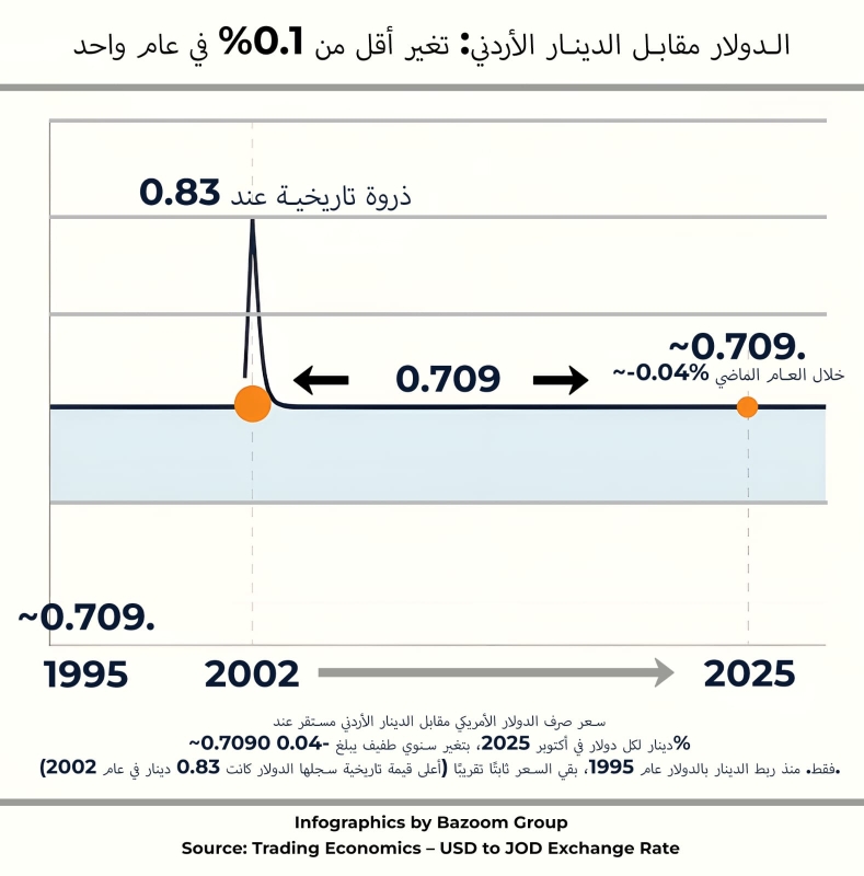 يرتبط الدينار الأردني بالدولار الأمريكي بسعر ثابت يبلغ حوالي 0.709 دينار لكل 1 دولار منذ أكتوبر 1995. هذا الربط جعل سعر صرف الدولار/الدينار أحد أكثر الأسعار استقرارًا في المنطقة، مع تغيرات طفيفة للغاية على مر السنين. على سبيل المثال، بلغ سعر الصرف 0.7090 دينار لكل دولار في أكتوبر 2025 وظل مستقرًا دون تغير يذكر (انخفاض سنوي أقل من 0.1% فقط). هذا الثبات يُعزى إلى سياسة نقدية حازمة من البنك المركزي الأردني تهدف للحفاظ على استقرار قيمة العملة. وللعلم، أعلى سعر تاريخي سجّله الدولار مقابل الدينار كان نحو 0.83 دينار في عام 2002 حين كان الدولار قويًا عالميًا – مما يدل على أن نطاق التقلب محدود حتى في أقصى الحالات.