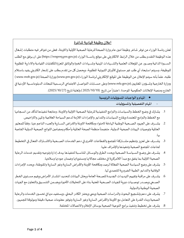 خبرني - أعلنت رئاسة الوزراء اليوم الأحد عن توافر شاغر وظيفة أمين عام وزارة الصحة للرعاية الصحية الأولية والأوبئة