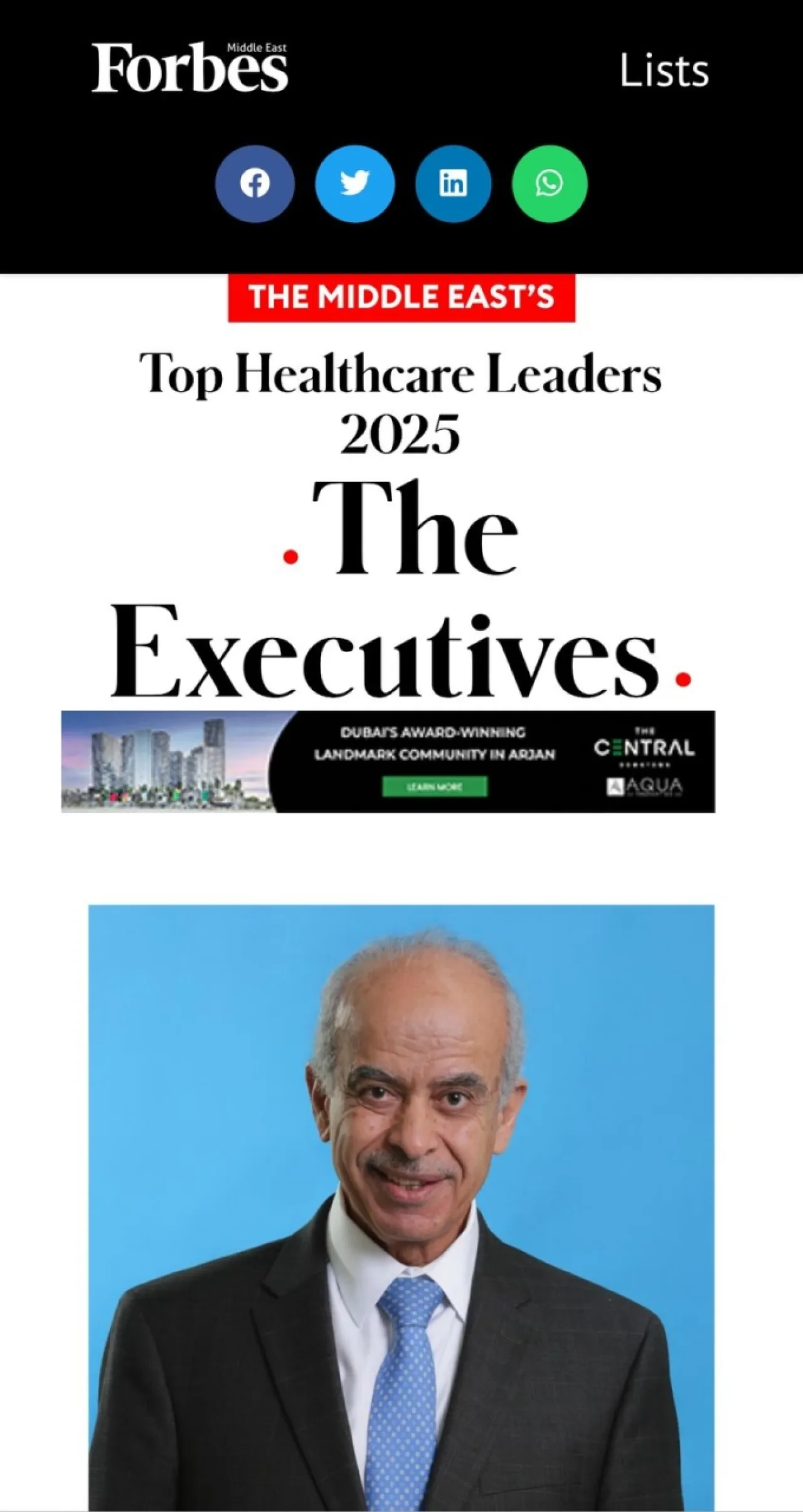خبرني - احتل الاستاذ الدكتور عبدالله البشير مكانةً بارزةً بين قادة الرعاية الصحية في المنطقة لعام 2025 في قائمة فوربس الشرق الاوسط الجديدة ،ونشرت المجلة الشهيرة القائمة مشيرةً الى أنّ هذه النخبة من صناع التغيير من الرؤساء التنفيذيين يعيدون رسمَ ملامح منظومة الرعاية الصحية في الشرق الاوسط للعقد المقبل .